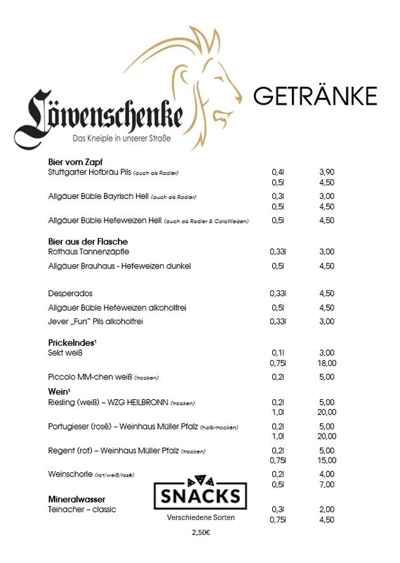 Genießen Sie in unserer "Löwenschenke" die gemütliche und fast schon vergangene Kneipenkultur. Kühles Bier vom Zapf und aus der Flasche, Wein, Sekt und mehr stehen für Sie bereit.